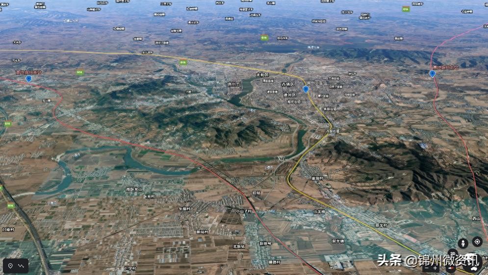 红色线是两条高铁线,黄色线是老的京哈铁路线,以下皆为卫星图。