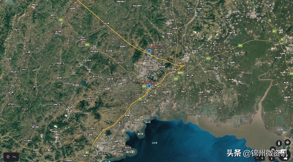 两条黄色线为高铁线,呈人字形在凌海市交汇。地图上北下南。