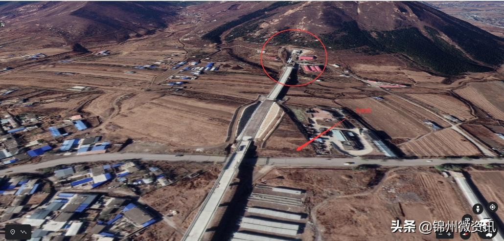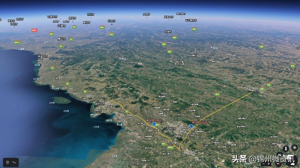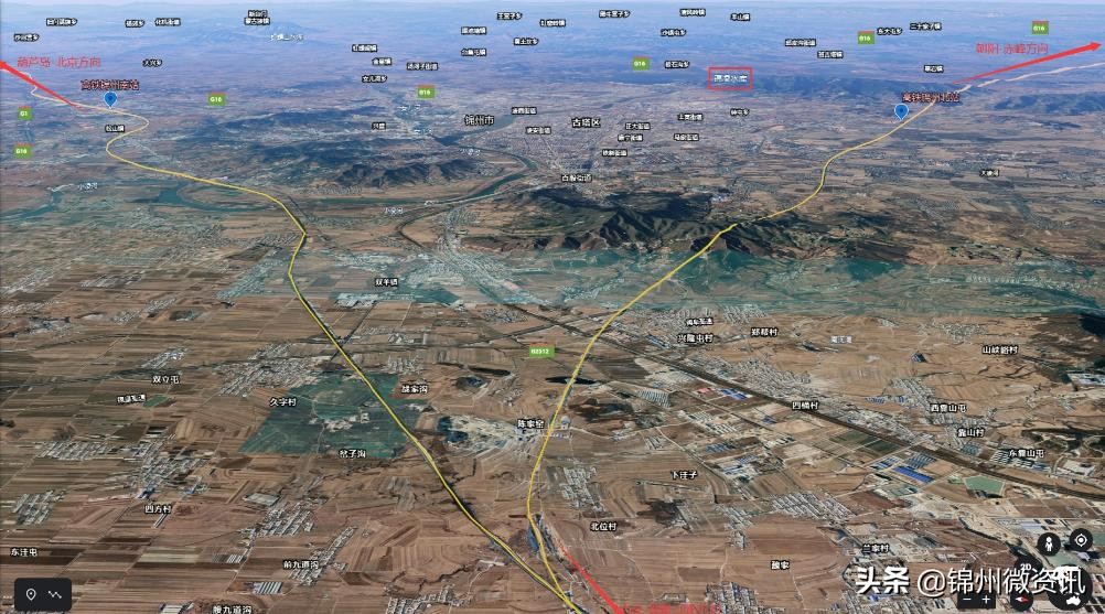 两条高铁线,上面黄线为新建高铁,穿观音洞隧道往朝阳赤峰方向。下面黄线为葫芦岛方向,两条线在凌海汇聚。