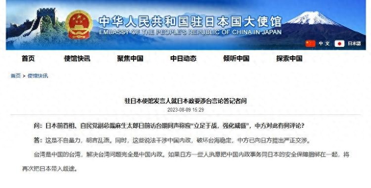 驻日使馆驳斥麻生太郎涉台言论:不自量力,胡言乱语