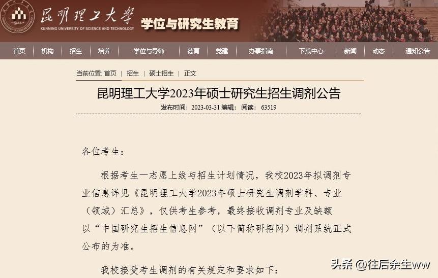 根据考生一志愿上线与招生计划情况,我校2023年拟调剂专业信息详见《昆明理工大学2023年硕士研究生调剂学科、专业(领域)汇总》,仅供考生参考,最终接收调剂专业及缺额以“中国研究生招生信息网”(以下简称研招网)调剂系统正式公布的为准。