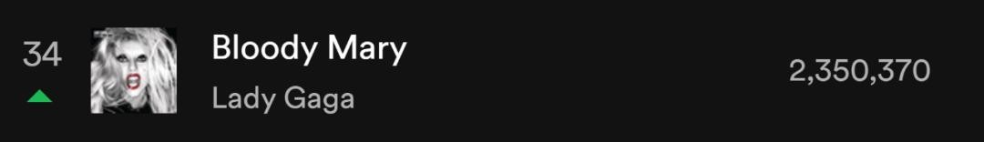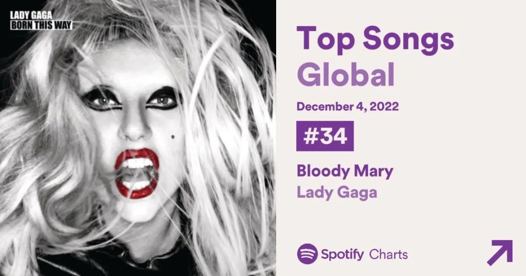 最近,美国天后 Lady Gaga 在2011年发行的摇滚经典专辑《Born This Way》其中的神曲《Bloody Mary》今日排名 Spotify 全球第34名,再次创造新高,播放量235万。这是发行之来这首歌曲获得最好的成绩,非常成功回归了人们的视野。