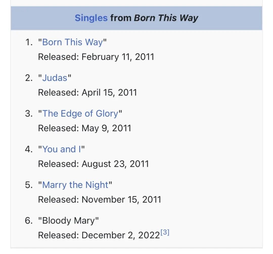 对此,传言Lady Gaga重启《Born This Way》专辑,将《Bloody Mary》作为专辑的第六支主打歌曲发行和宣传,重新打单。