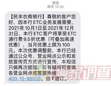 对涉及到“折扣,封顶”等关键的信息,消费者应拥有充分的知情权。事实上,在江苏交通广播网关注,并与民丰银行沟通后,11月30日,肖先生才收到了ETC变更优惠的短信通知。