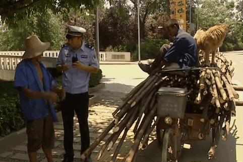 说的是一位骑着电瓶车的大爷拉着超长的木板,被半路执勤的谭警官逮个正着。