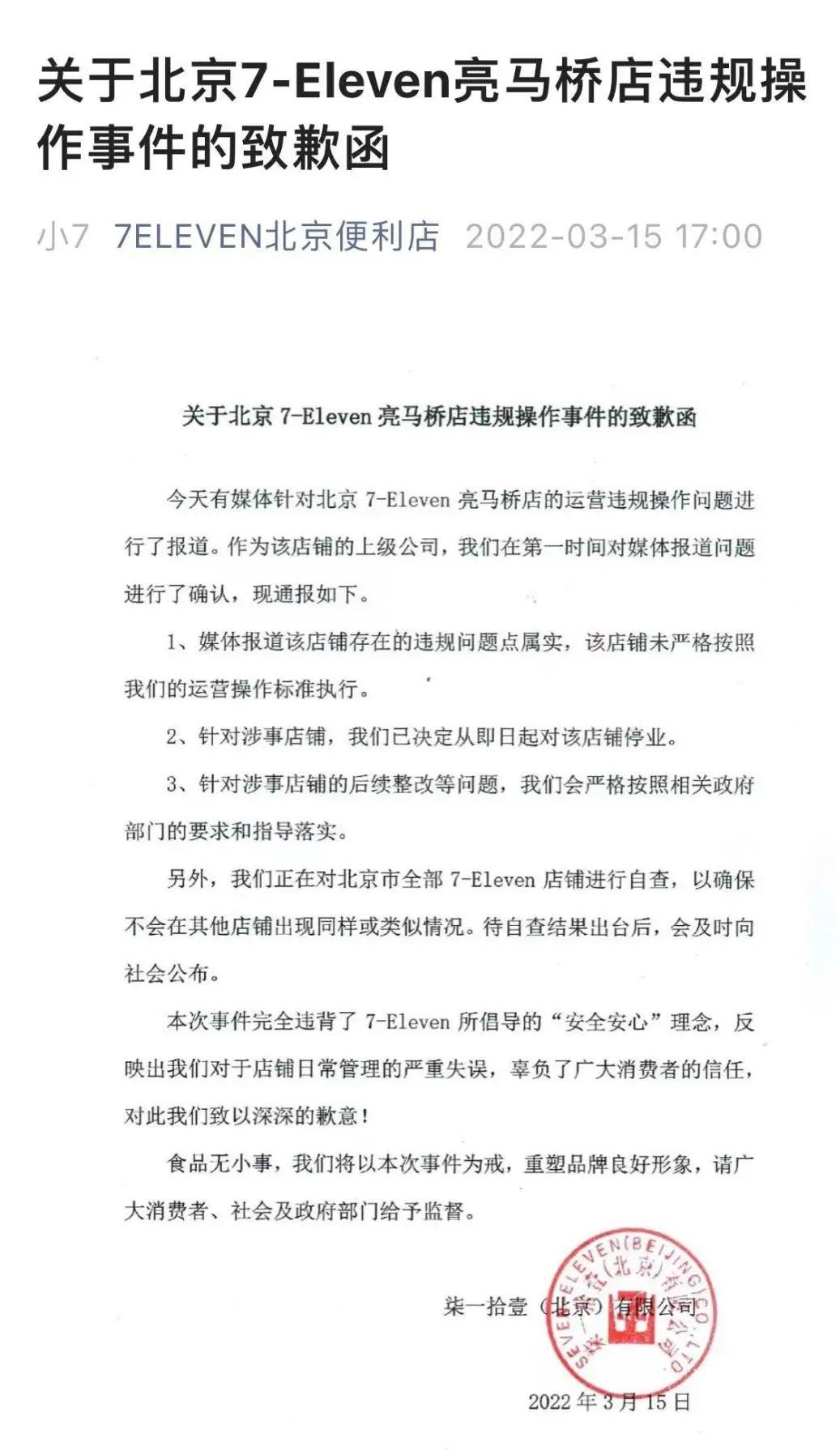 3月15日下午,7-11北京便利店在公众号致歉,并对涉事的亮马桥店做出停业整改处理。同时,还表示正在对北京全市的店铺进行自查,自查结果出台后会及时向社会公布。