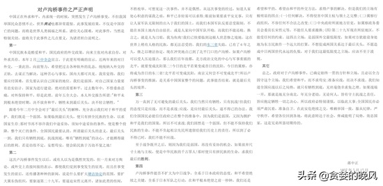 7月17日,蒋介石在庐山发表著名的"最后关头"演说和《对卢沟桥事件之严正声明》,指出"再没有妥协的机会,如果放弃尺寸土地与主权,便是中华民族的千古罪人","如果战端一开,那就是地无分南北,人无分老幼,无论何人,皆有守土抗战之责任,皆抱定牺牲一切之决心。我们只有牺牲到底,抗战到底,惟有牺牲的决心,才能博得最后的胜利",蒋介石在身边的石柱上书写着"养天地正气、法古今完人"10个大字,与会场气氛相互浸染。虽然没有对日宣战,却表达了全民抵抗之决心。