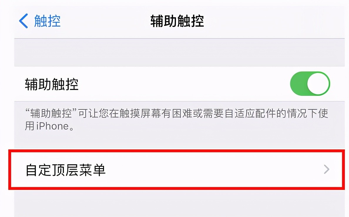 5、开启“辅助触控”功能后,点击“自定顶层菜单”选项。