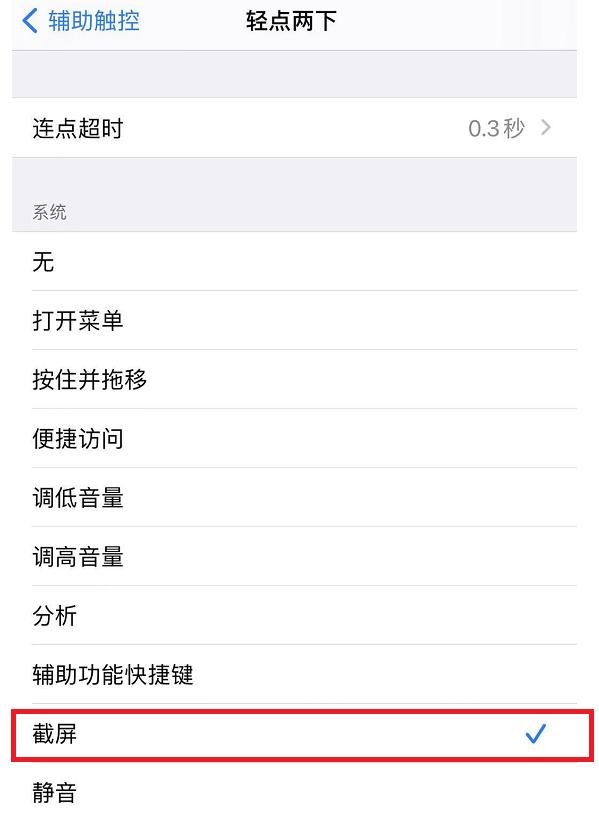 7、开启自定操作截屏,可在“辅助触控”中,选择“轻点两下”。