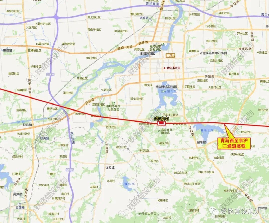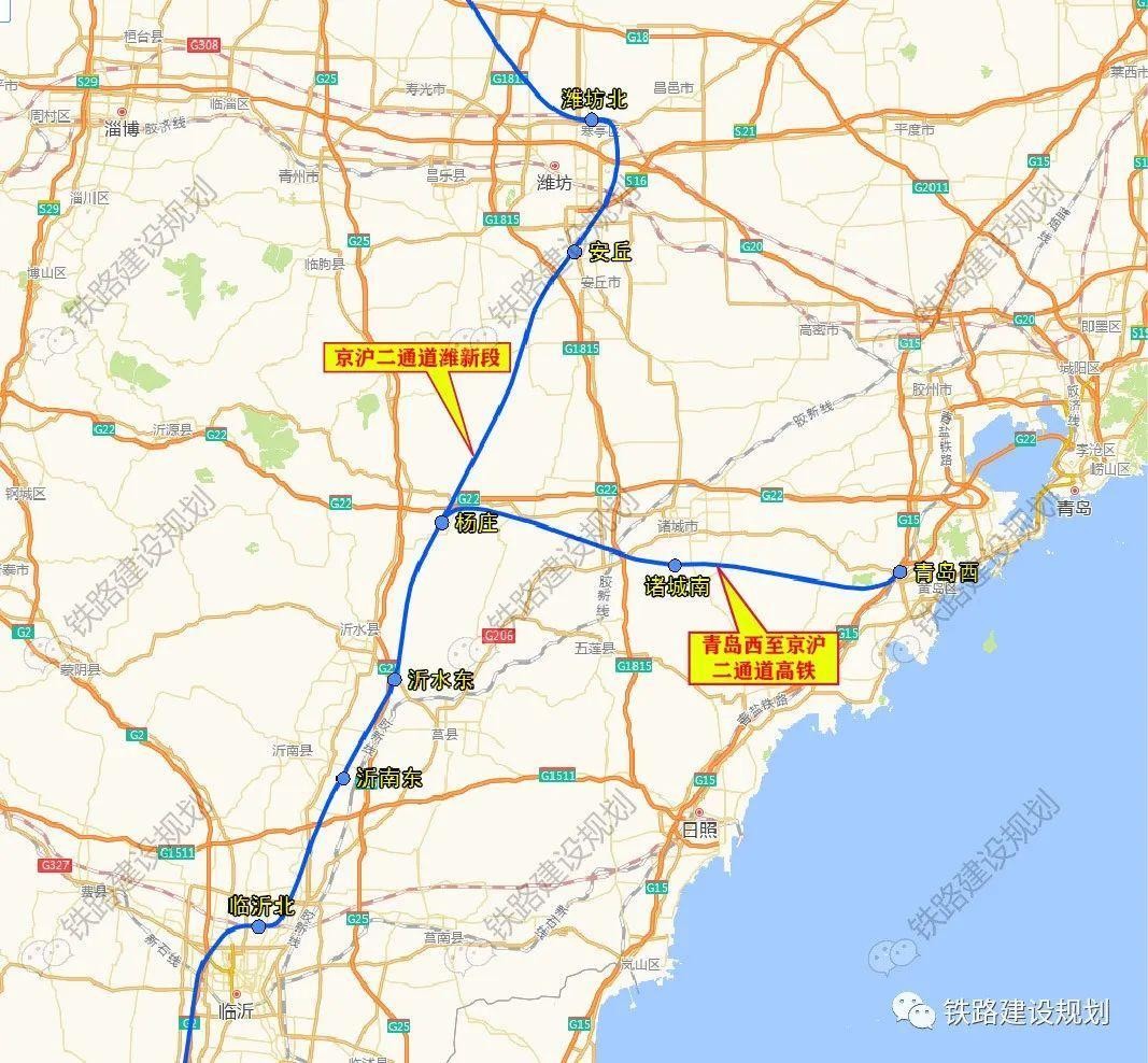 青岛西至京沪高铁二通道铁路起自青盐铁路青岛西站,向西以隧道穿越铁镢山,走行于诸城市南侧、五莲县北侧,于常山大道东侧、东山坡村北侧设诸城南站,向西北跨越潍日高速、206国道和222省道后转向西走行,最后引入规划潍新铁路杨庄站,线路长度106.88km。