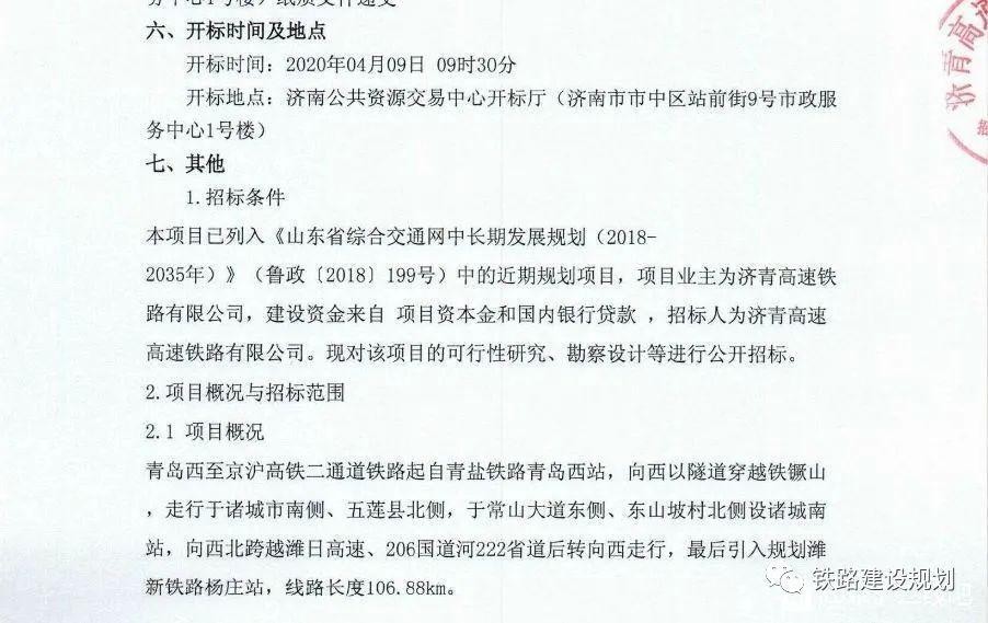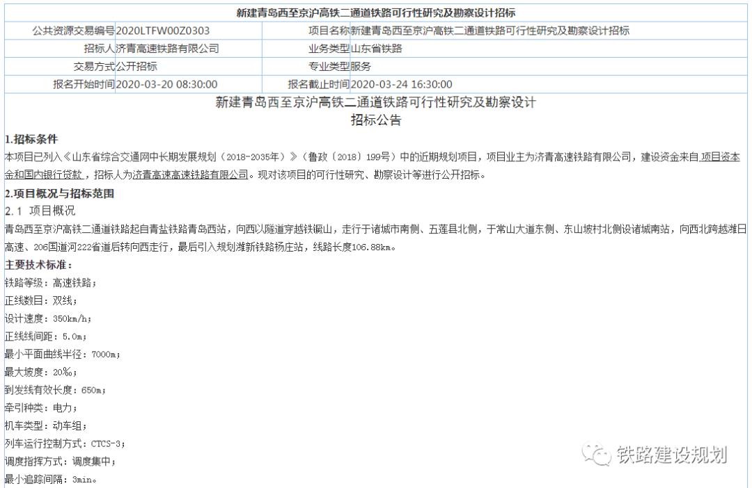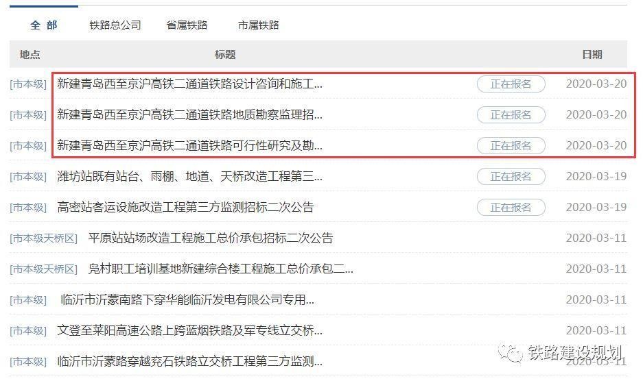 3月20日,济青高速铁路有限公司发布了《新建青岛西至京沪高铁二通道铁路可行性研究及勘察设计》以及设计咨询和施工图审核、地质勘察监理招标等3则招标公告。预示着该项目前期工作正式启动,年内将完成可行性研究报告批复及施工图设计等所有开工前期工作。