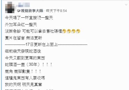 除了谢先生之外,我国台湾省也有一名男子喝下浸泡多年的蛇酒。这名男子在社交媒体上发文表示,自己租了一个店铺,而店铺的前身是一家蛇铺,在收拾东西的过程中,陆续找到了多个“宝贝”,其中就有一瓶浸泡了30年之久的蛇酒。