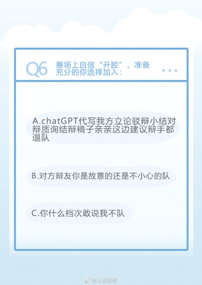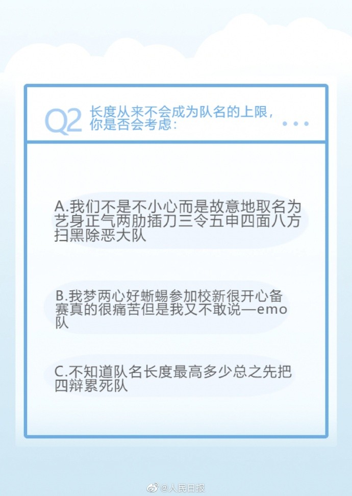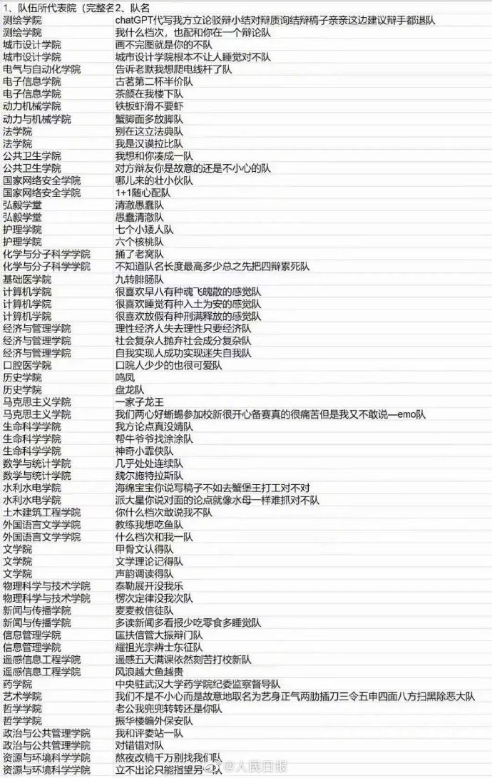 此前该校辩论队曾向媒体回应称,关于队名,会在不触碰道德、法律等底线问题的情况下,确保大家有自由发挥空间。虽然队名看似随意,但各院系学生参与辩论赛的态度都十分认真。