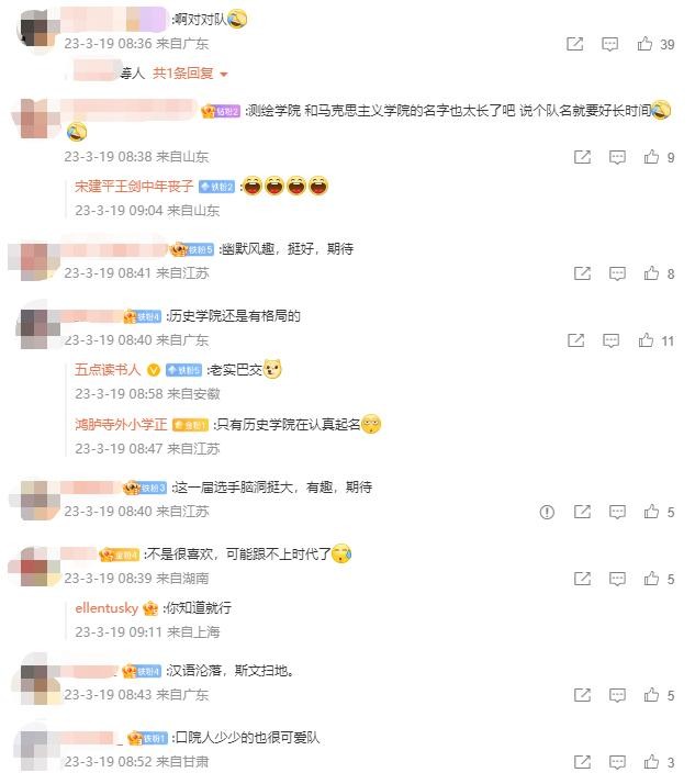 “这一届选手脑洞挺大,有趣,期待”“武大每年的名字都好好笑”“历史学院还是有格局的”“哈哈哈哈哈哈哈哈哈大学生是这样的”“卷起来了”“大学生有趣的灵魂按耐不住了”,网友纷纷评论表示。