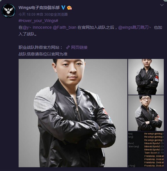 而就在今天,也就是“入队期”开启的第一时间,Wings战队官方微博宣布,目前y丶Innocence、Faith_bian、wings跳刀跳刀丶三名队员已经重新回归队伍,并告诉大家不要盲目猜测,一切以官方信息为准。