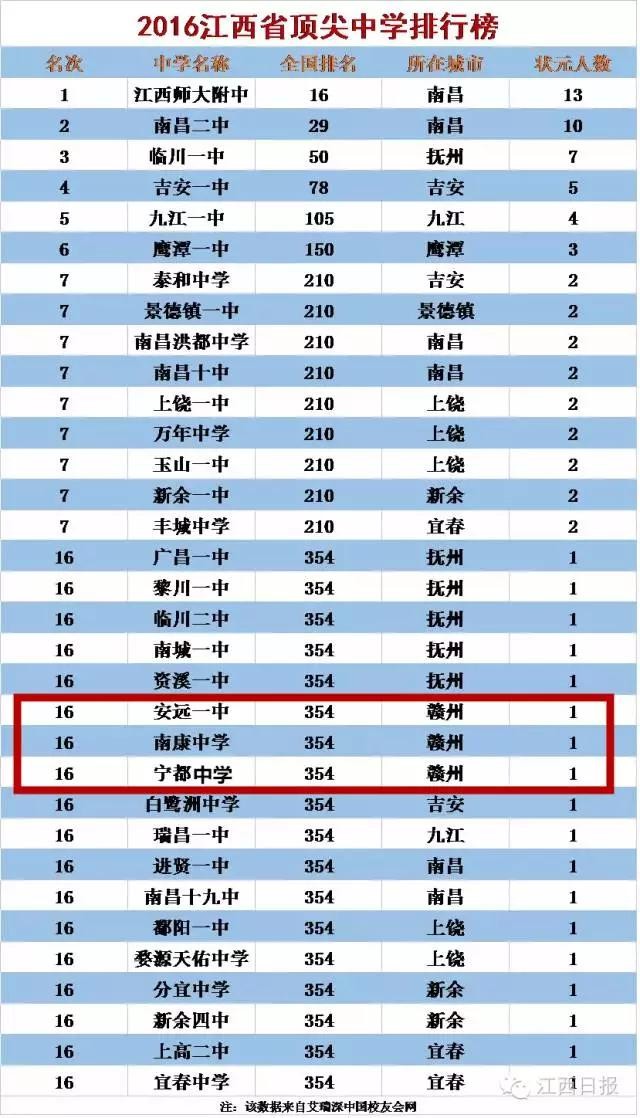 近日,《艾瑞深中国校友会网2016中国顶尖中学排行榜800强》新鲜出炉,江西共有33所中学上榜,赣州有3所,咱大安远名列赣州榜首。