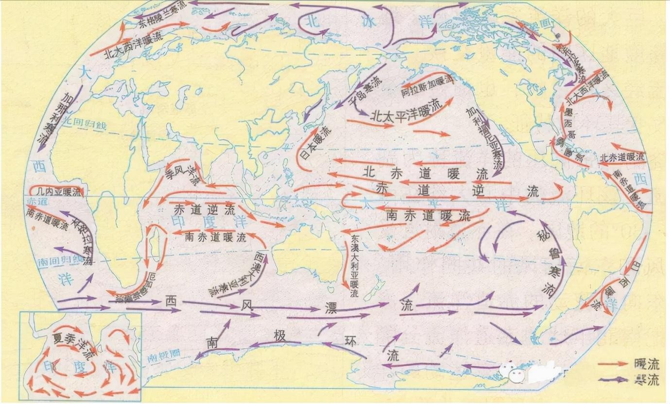 意思是:热带主要是暖流,寒带主要是寒流。比如赤道附近的赤道暖流、逆流等,南寒带的西风漂流,北极圈附近的寒流等。