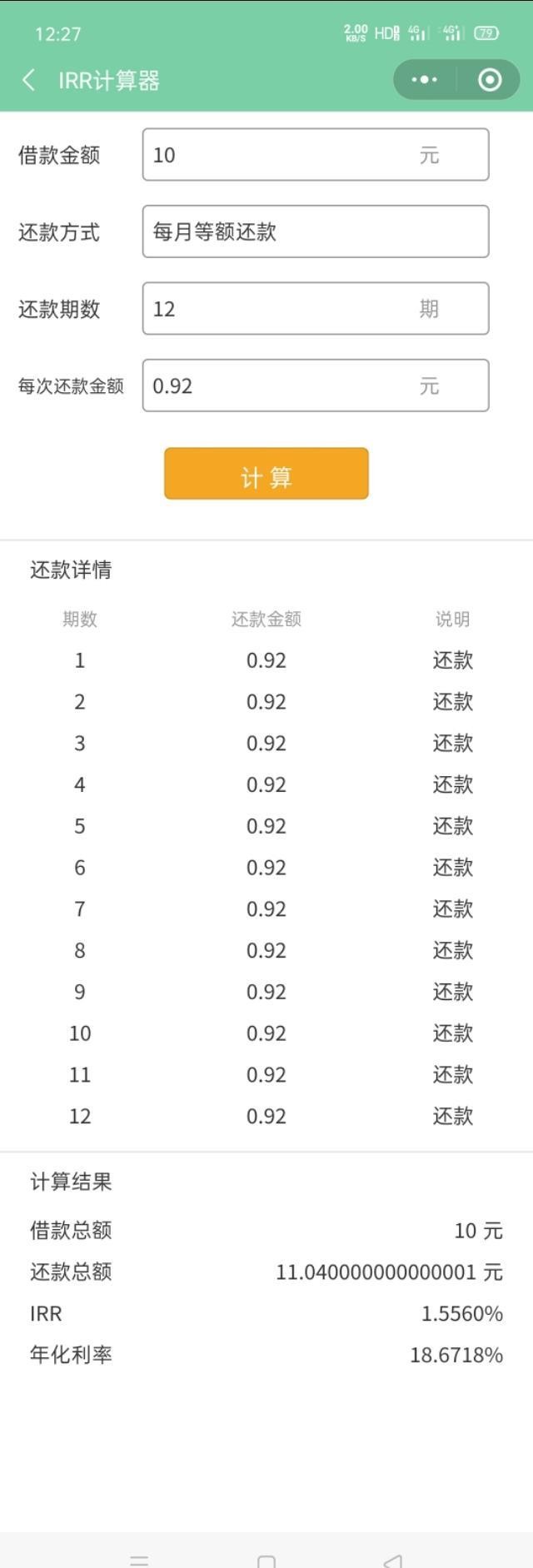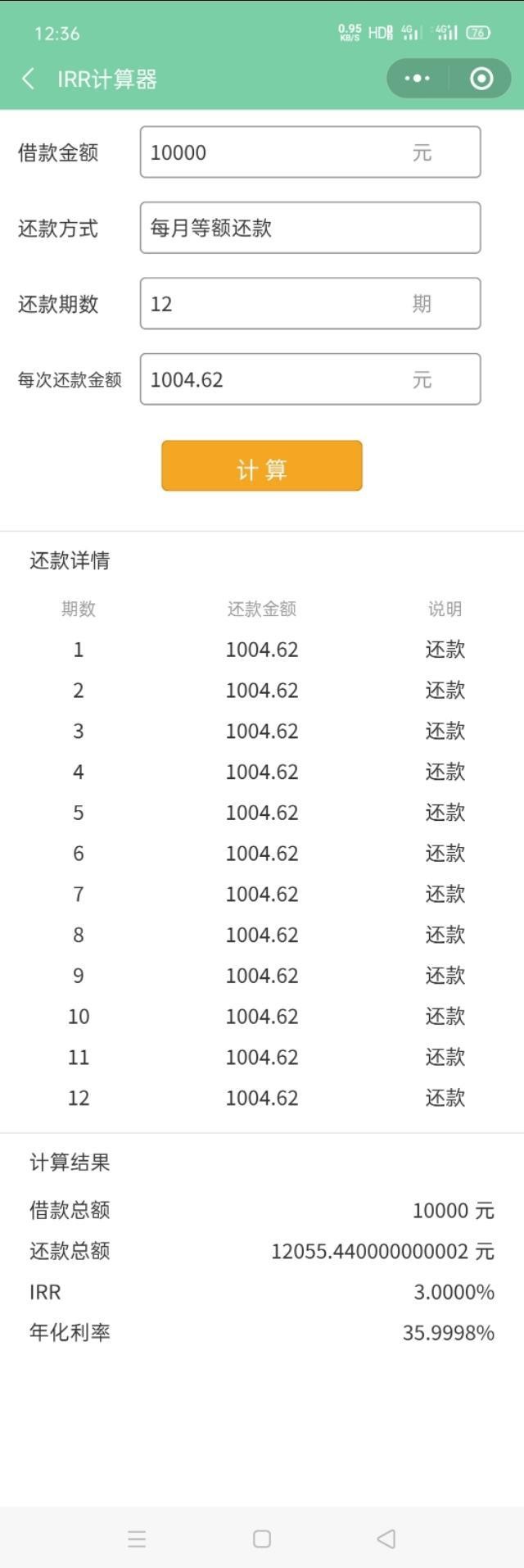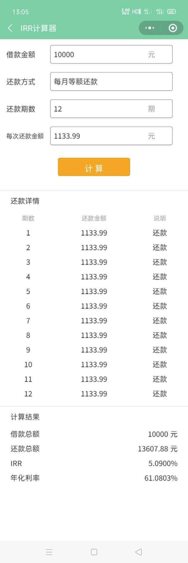 假设你借款10000元,一年分12期还款,每个月固定还款1133.33元,总计还款13600,那么实际年化率:
