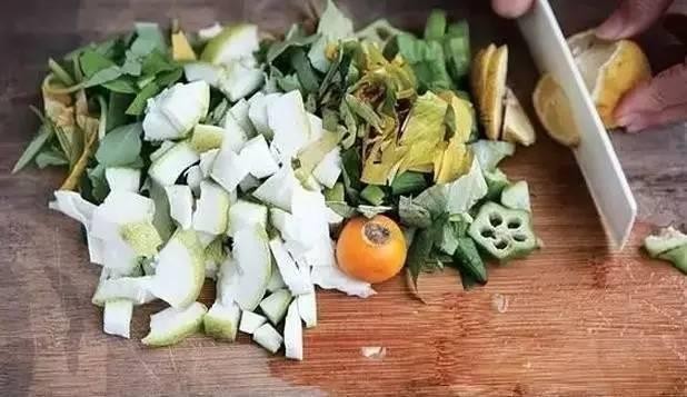 2.将鲜垃圾(果皮,烂菜叶之类)切碎后倒入容器里,果皮菜叶比例是糖的3倍,也可以适当多一些。