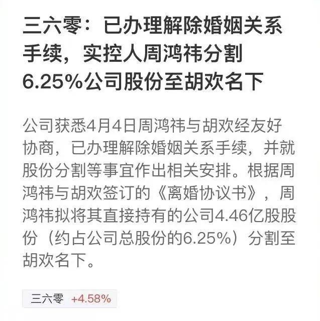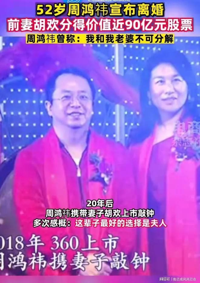 然而,即便是最美好的故事也可能有不同的结局。2023年4月4日,周鸿祎与胡欢宣布离婚,结束了长达25年的婚姻。根据官方公告,周鸿祎将其直接持有的公司约6.25%的股份转给胡欢,这些股份当时的市值约为89.7亿元。周鸿祎在抖音上发布的一段视频中提到,他们的结婚纪念日是317,一个不可分解的质数,象征着他们婚姻的坚固和唯一性。尽管他们的婚姻走到了尽头,但这段历程对两人的人生都产生了深远的影响。