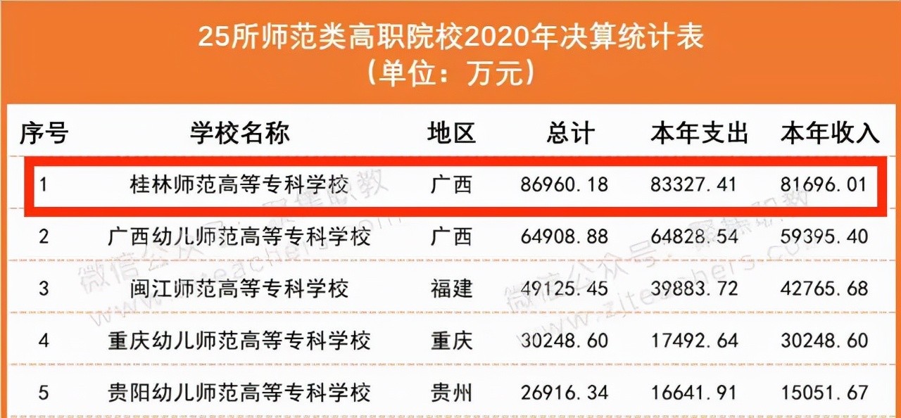 据相关机构发布的消息,在“25所师范类高职院校2020年决算统计表”中,桂林师范高等专科学校以全年收入81696.01万元,位居第一名,而且该校在“2021年师范专科院校排名”里,位居全国第二名。
