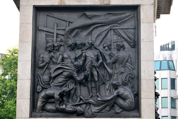 广场中央耸立着高53米的纳尔逊纪念柱,石柱顶端立着的便是纳尔逊铜像。纳尔逊头戴船型三角帽,身穿燕尾军装,左手撑着一柄剑,脚下是一堆缆绳。纪念柱的基座四面嵌有四幅青铜浮雕,反映的是纳尔逊的一生中最为人所熟知的战役:圣文森特角战役、尼罗河战役、哥本哈根战役和特拉法加战役。特拉法加海战的场面。据说雕塑的金属部分就是用缴获的法国海军铜炮铸造成的。