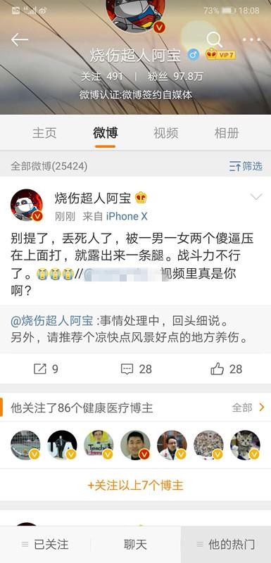 2日下午,宁方刚发布微博称:“别提了,丢死人了,被一男一女两个XX压在上面打,就露出来一条腿。战斗力不行了”。在回复网友的留言中,宁方刚称,事情处理中,他还让网友推荐个凉快点风景好的地方养伤。