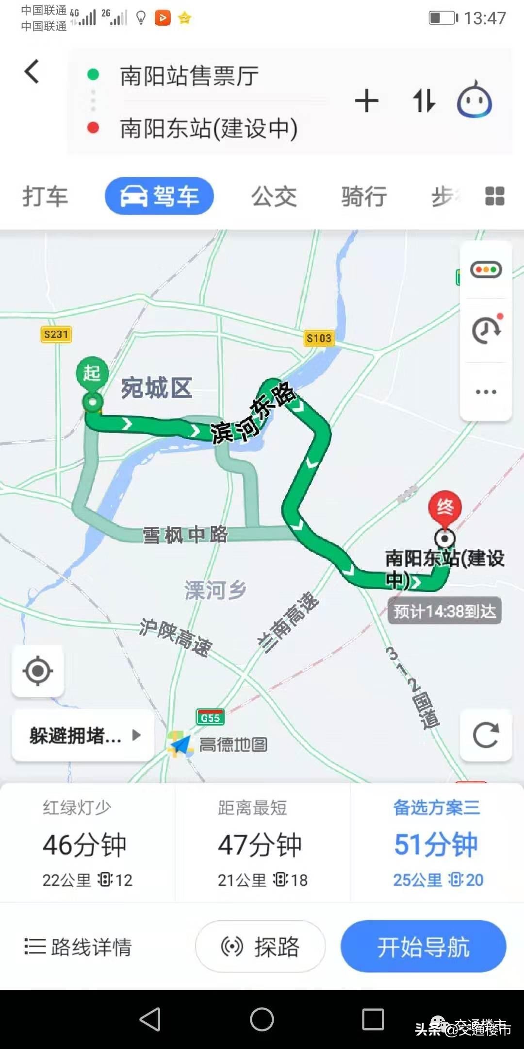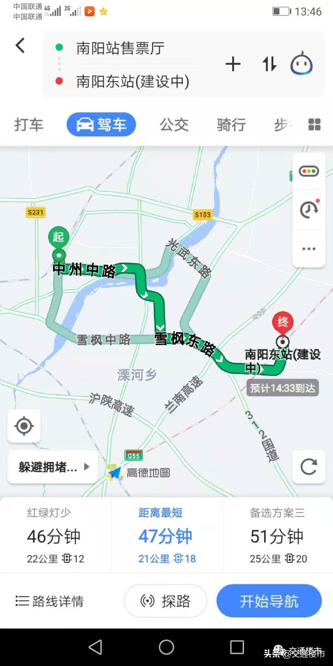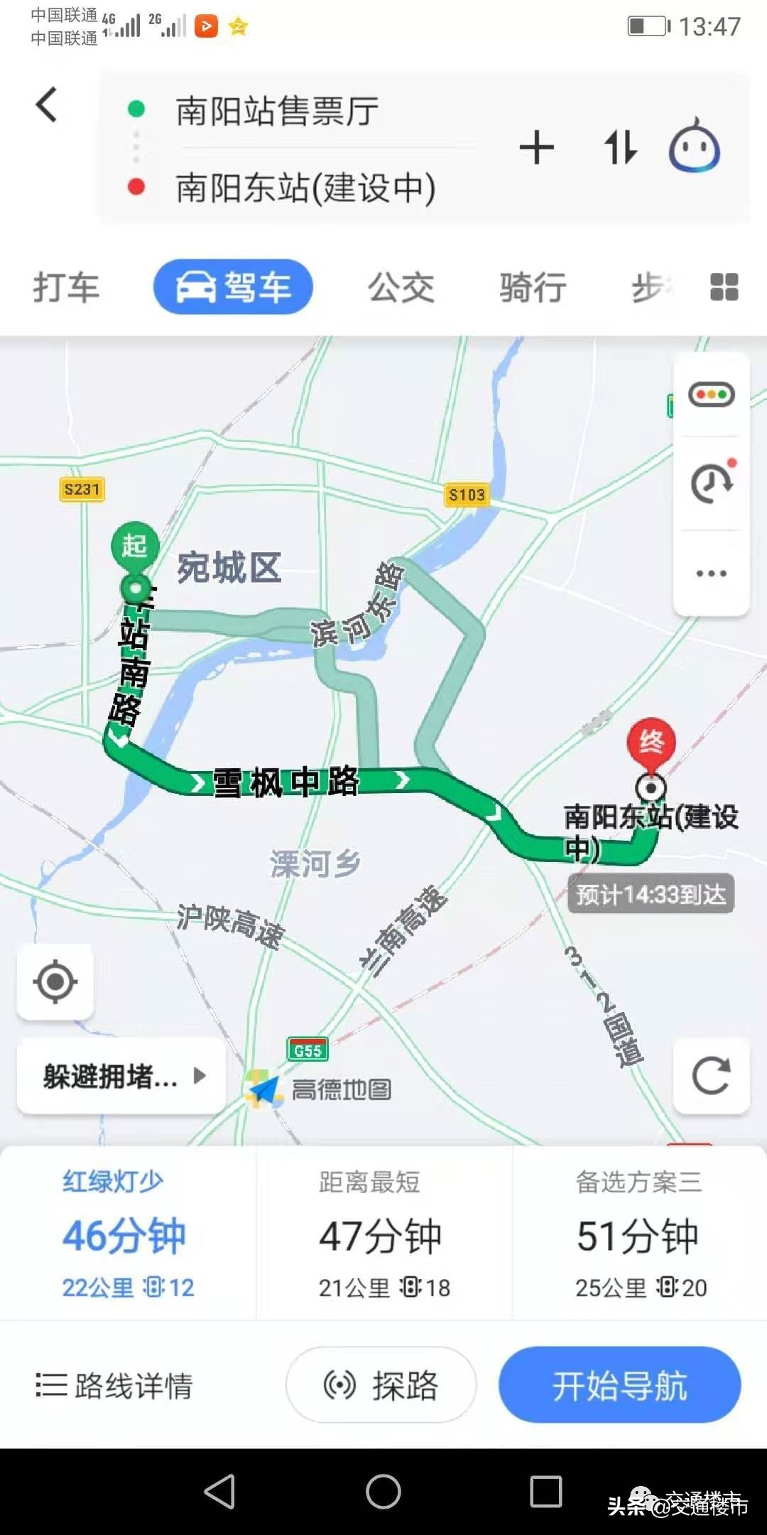 上面是高德地图导航从南阳火车站到南阳东站的具体线路。最短距离为21公里,最快时间是46分钟,这只是按当前的路况推测。可以说基本上说是要1个小时的时间。
