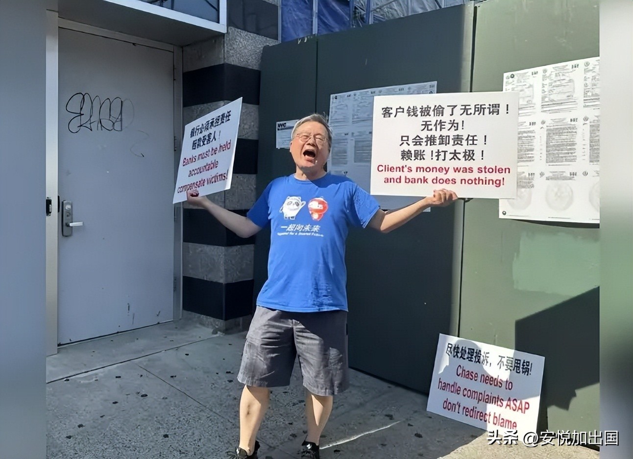 过去几年遭遇银行资金被盗的多位华裔客户21日下午在法拉盛社区守望互助队队长朱立创的帮助下,在法拉盛街头举行抗议活动。