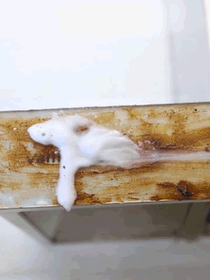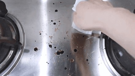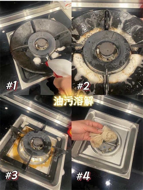 你就会看见厚厚的油垢慢慢分解,用抹布轻轻一擦,油垢瞬间消失不见。