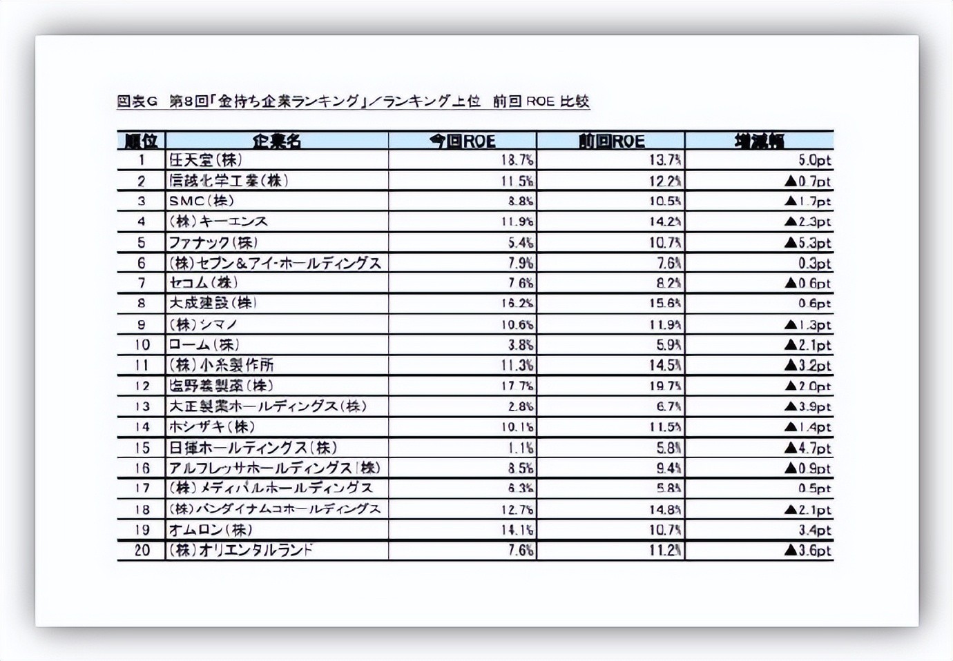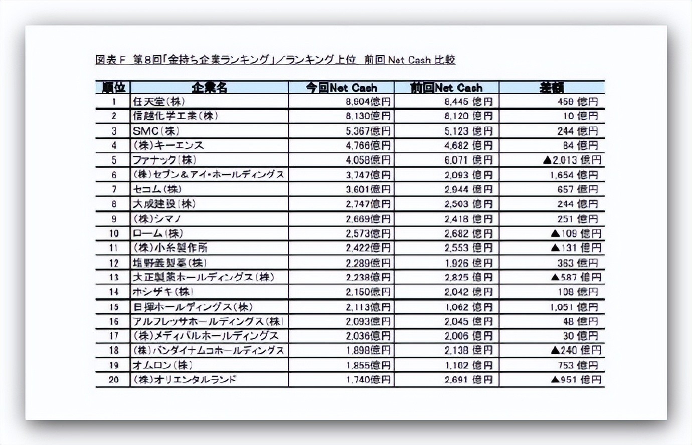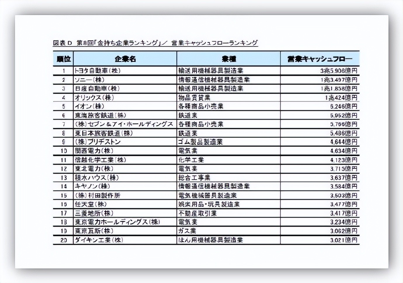 和上年的排名顺序比较,日挥控股从42位上升到了第15位、欧姆龙从39位上升到了第19位,大幅度地提升了排名,都进入了前20名。由于这两个公司的营业现金流增加,积蓄了现金存款,使现金增加。“7和I控股”由上年的19位上升到了第6位,维持着高水平的营业现金流积蓄了存款,同时总负债减少,使现金增加。其它进入前20位的名单没有看到大的变化。东芝由于上年出售了部分业务而获得了较多的现金在上年的排名中名列第一,这次因现金489亿日元、营业现金流减少1421亿日元减少了很多,大幅度的降到了2647位。