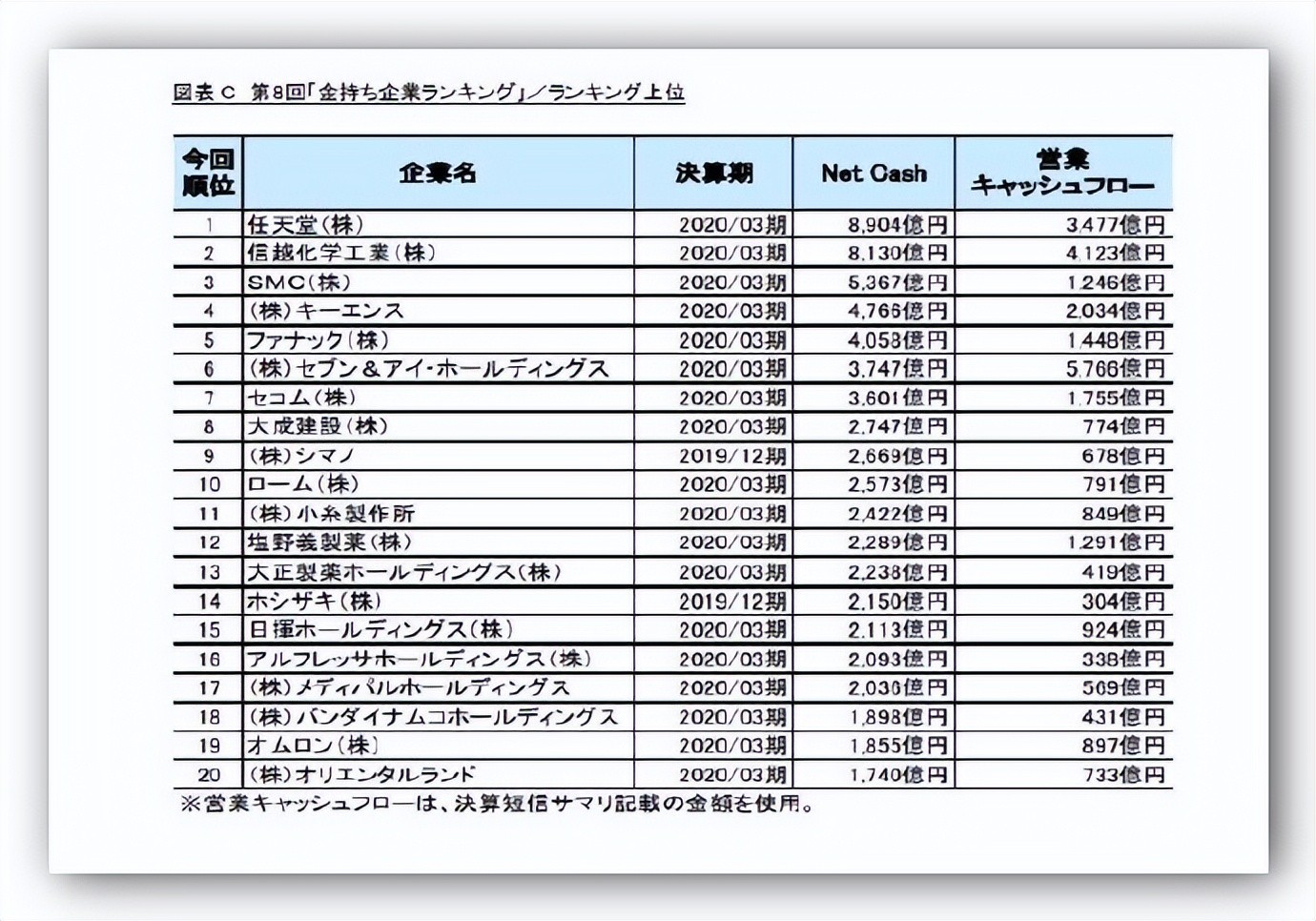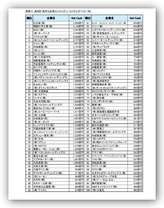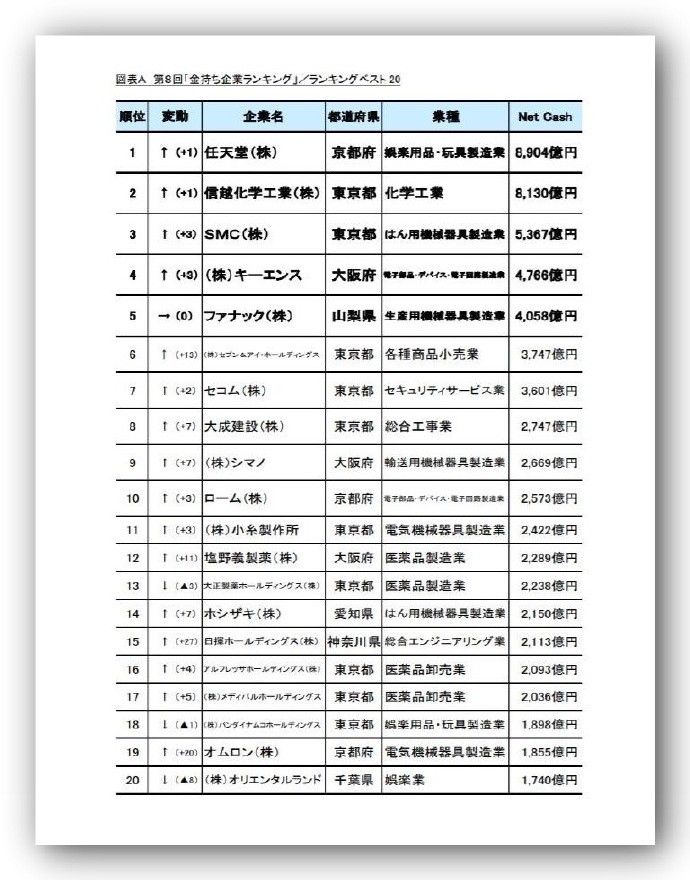 另一方面,以位居前二名的任天和信越化工为首,每次都排名上升的企业,以稳定的业绩创造出营业现金流、积蓄现金的企业很多。