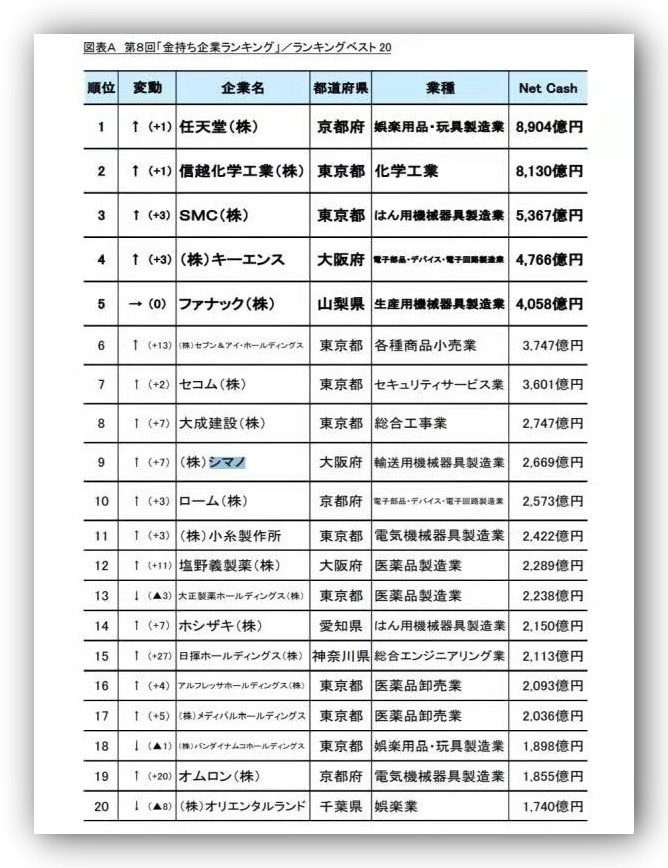 “任天堂 ”以净现金8904亿日元位居第一。排名第二的信越化工的净现金为8130亿日元。“SMC”以净现金5367元跻身第三。随后是基恩士(4766亿日元)、发那科(4058亿日元)、7和I控股(3747亿日元)、西科姆(3601亿日元)。