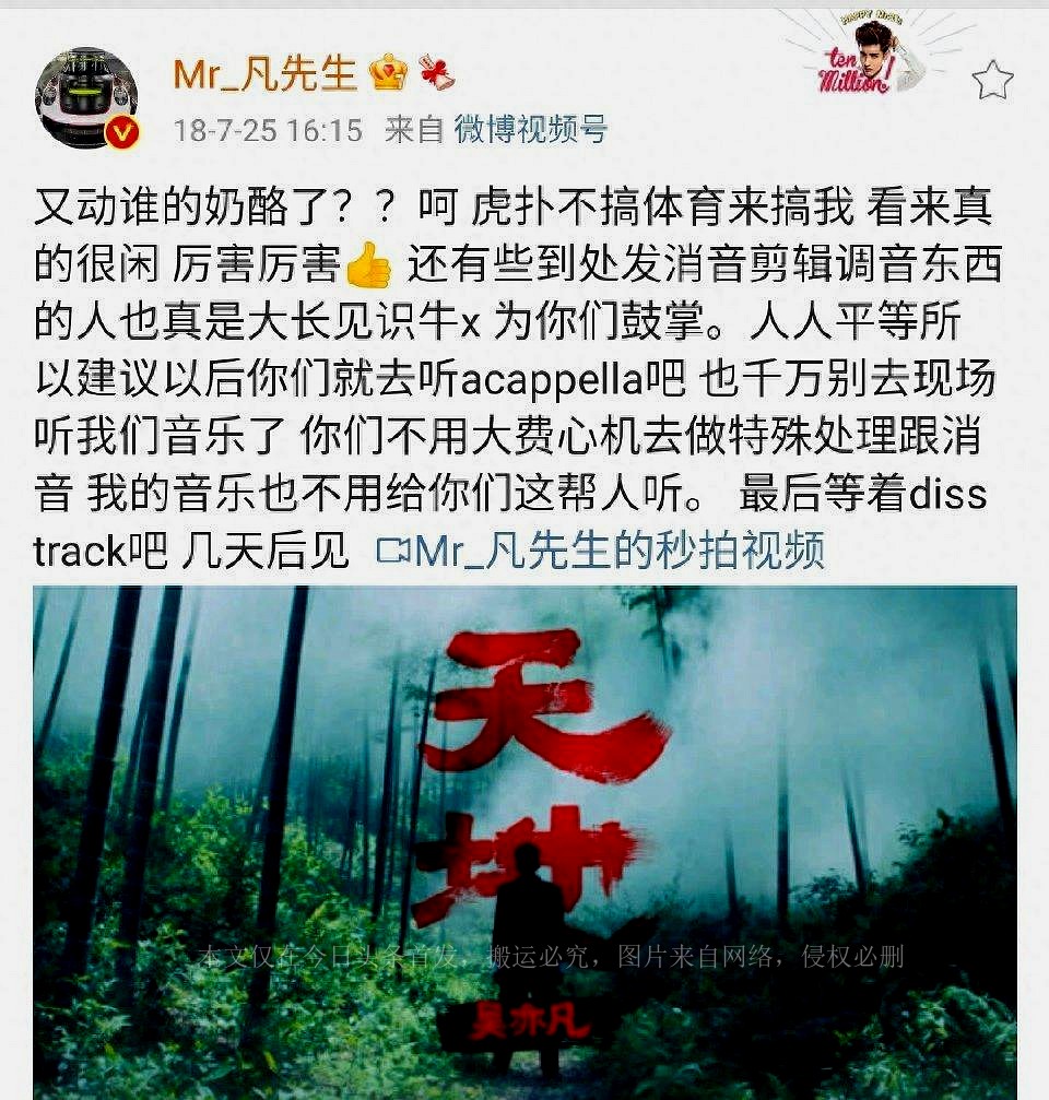 这场大战持续了数天,吴亦凡亲自出马,并发布了那句经典的名言:“又动了谁的奶酪?”这时候,我觉得斯宾塞应该也站出来了。虎扑则对吴亦凡的回应表示反击,提出对这首歌的水平进行了质疑。当时,我以为这场口水战会以吴亦凡的回应告一段落,但没想到,君子报仇十年不晚。