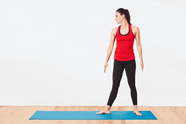 ◆山式站立,右脚向右转,上半身和头部向右侧扭转;