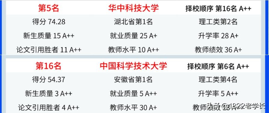 浙大排在第2,华科武大分列第5和第6名,中大川大分列第8和第9名,而南京大学仅排第10,中国科学技术大学更是排在了第16名。