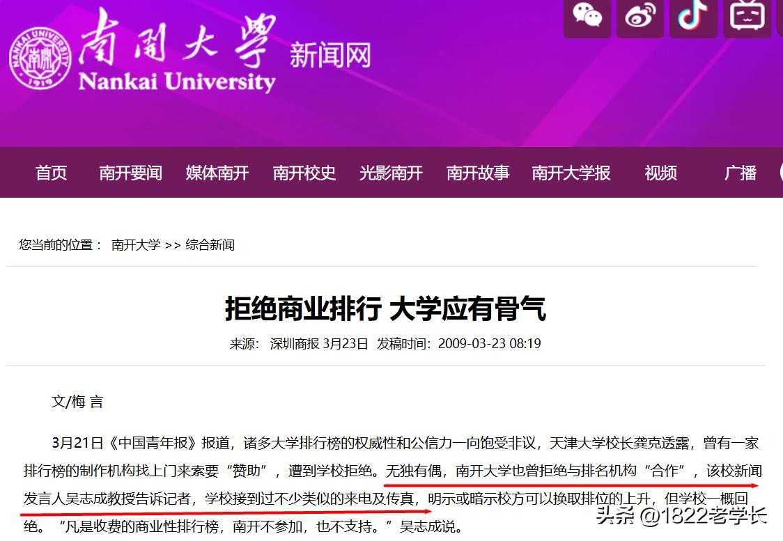 国内有很多高校不屑于大学排名,在十几年前,敢于掀桌子拒绝排行榜的高校是南开大学,所以南开的各类排名都很一般。天大也是铮铮铁骨,拒绝商业排行榜。如今越来越多的高校似乎在从排行榜中抽离出来。