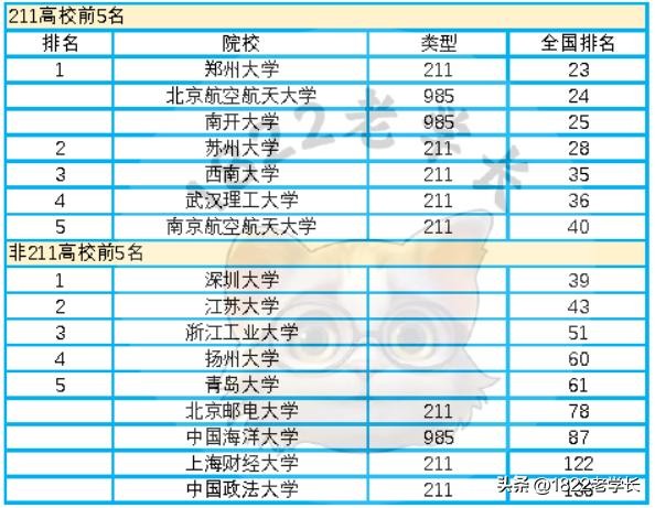 985的排名如此,211的排名也是如此,举个例子郑州大学位列第23名,超过了北航和南开两所一流的工科和文理院校。211高校,前5名为:郑州大学(23)、苏州大学(28)、西南大学(35)、武汉理工(36)、南航(40)。
