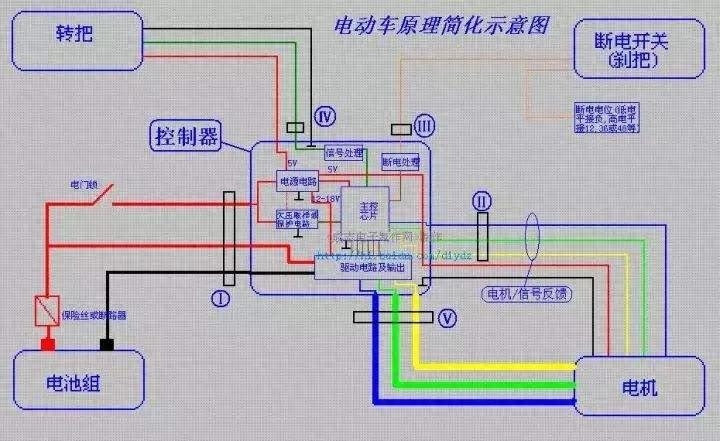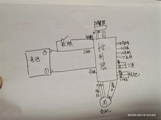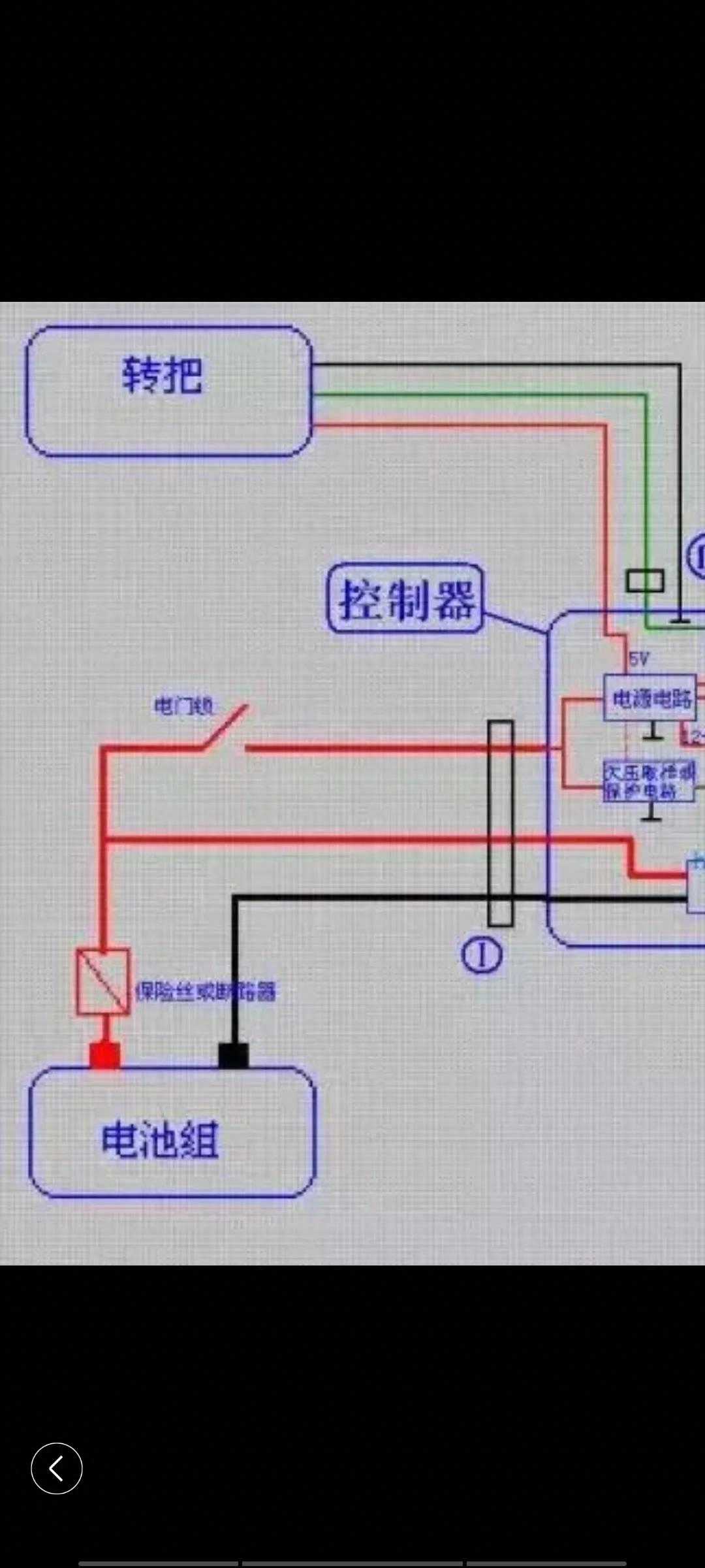 想要检测关于电门锁锁线的好坏,首先要了解电门锁的工作原理,我们都知道,控制器上面有三根电源进线,两根是电池的正负极,一根是锁线。大家看一下电动车线路图。
