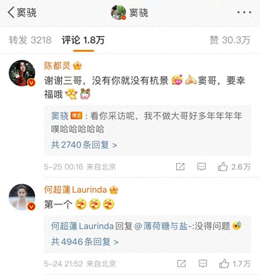 估计是看到男友终于红了,有点危机感,何超莲也在男友的微博下留言,只是说第一个,可能她在抢沙发。比较尴尬的是很多CP粉将女主演陈都灵送上了留言榜第一名,陈都灵说谢谢三哥没有你就没有杭景,窦哥要幸福哦。陈都灵也是在祝福窦骁和何超莲的恋情吧?窦骁回复说看陈都灵的采访了,自己不做大哥好多年了。看来是在避嫌,担心太多互动引发女友的不满。窦骁没有回复何超莲,不知道何超莲会不会很在意?