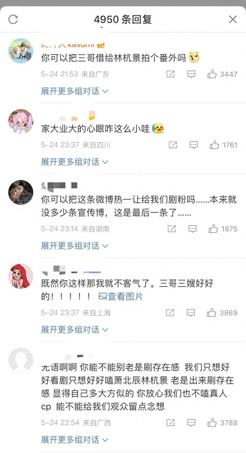 还有的认为何超莲一直在窦骁微博刷存在感,自己只想好好嗑萧北辰林杭景,老是出来刷存在感,显得自己多大方似的,放心大家不嗑真人CP,能不能给剧粉留点念想。