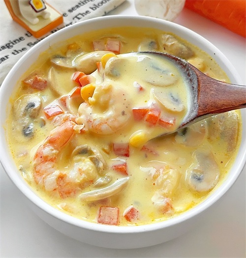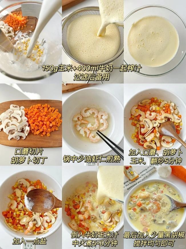 食材:玉米、胡萝卜、虾仁、蘑菇、牛奶。
