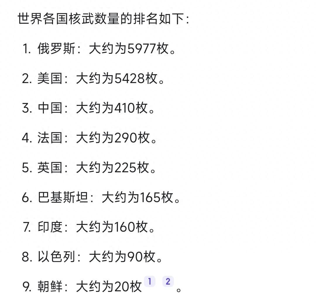 需要注意的是,各国核弹头数量只是一个相对粗略的估计,并且会随着时间推移而发生变化。此外,除了核弹头数量之外,核武器的质量和投送能力也是评估一个国家核实力的重要因素。