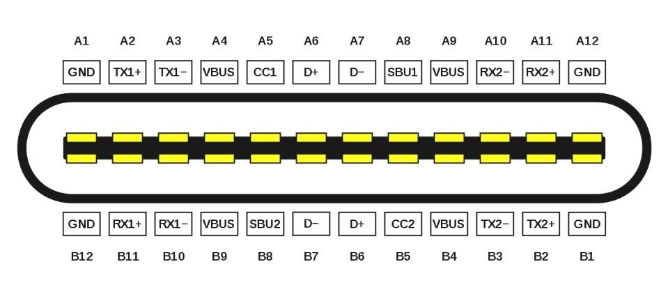 关于USB Type-C的内部电路而言,要比原来的USB Type-A、USB Type-B复杂。其内部有24个触点,包含4个GND、4个VBUS、2个CC、2个SBU、2对D+/D-、4对TX/RX组成。