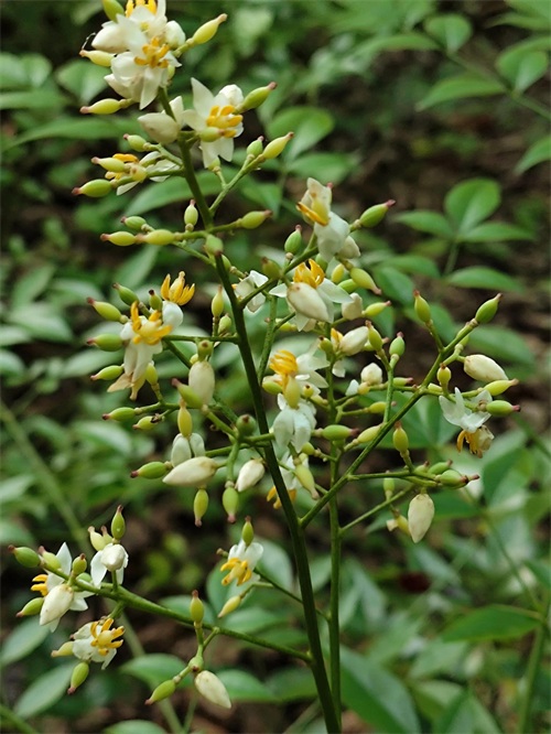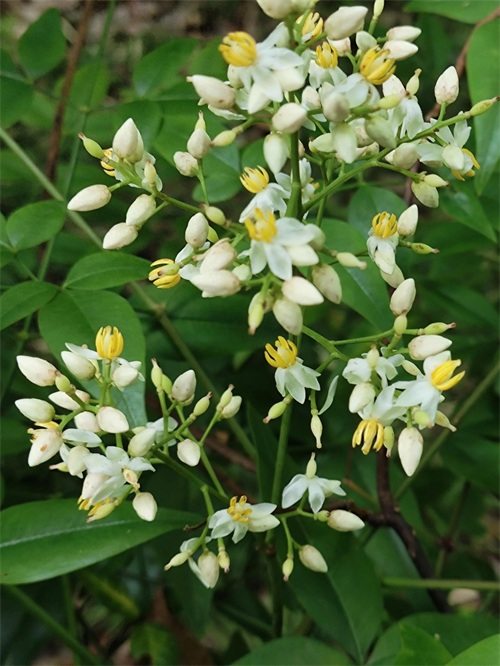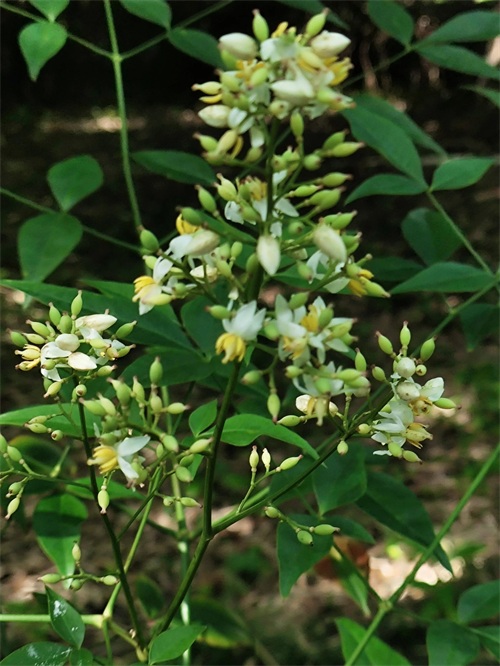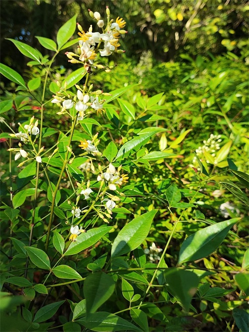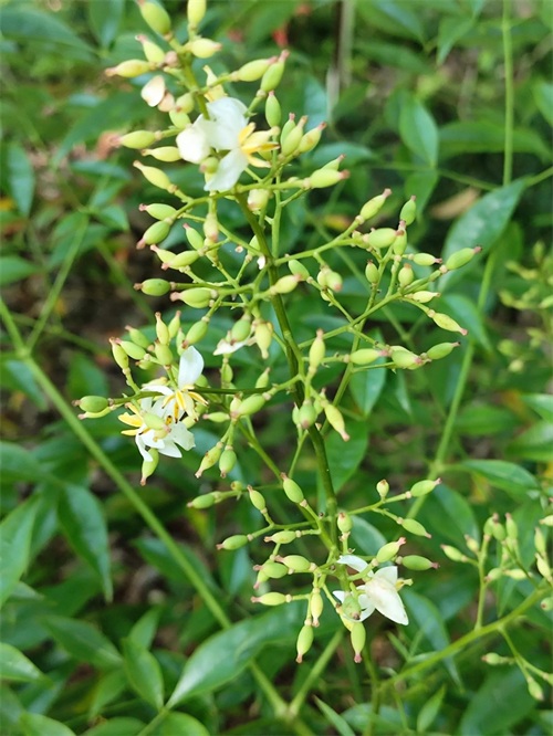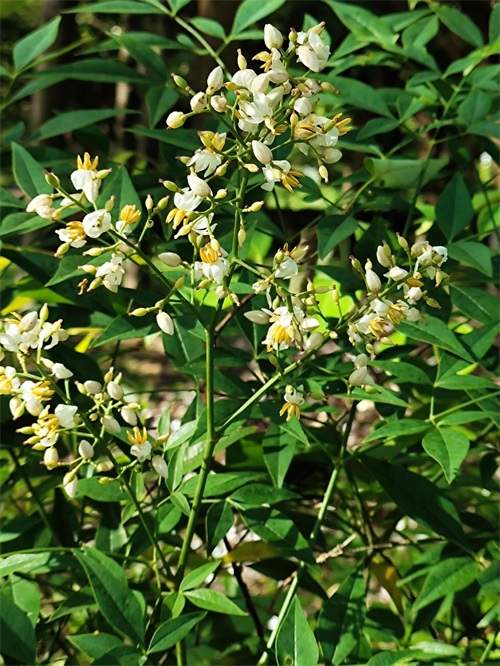 南天竹的叶子为互生,集中生长在茎的上部,形成了独特的三回羽状复叶结构,长度约为30-50厘米。春未夏初时节,南天竹会开出小巧的白色花朵,组成直立的圆锥花序,花期一般从3月持续到6月。