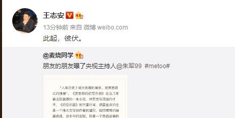 7月26日,朱军被网友爆料曾猥亵女实习生。该网友贴出的长文中,女生自曝当时朱军在化妆室隔着衣服猥亵她,幸亏阎维文进来了才中断。随后,女生报警,但是此事还是不了了之。随后王志安、罗昌平等网络大V纷纷转发了此消息。