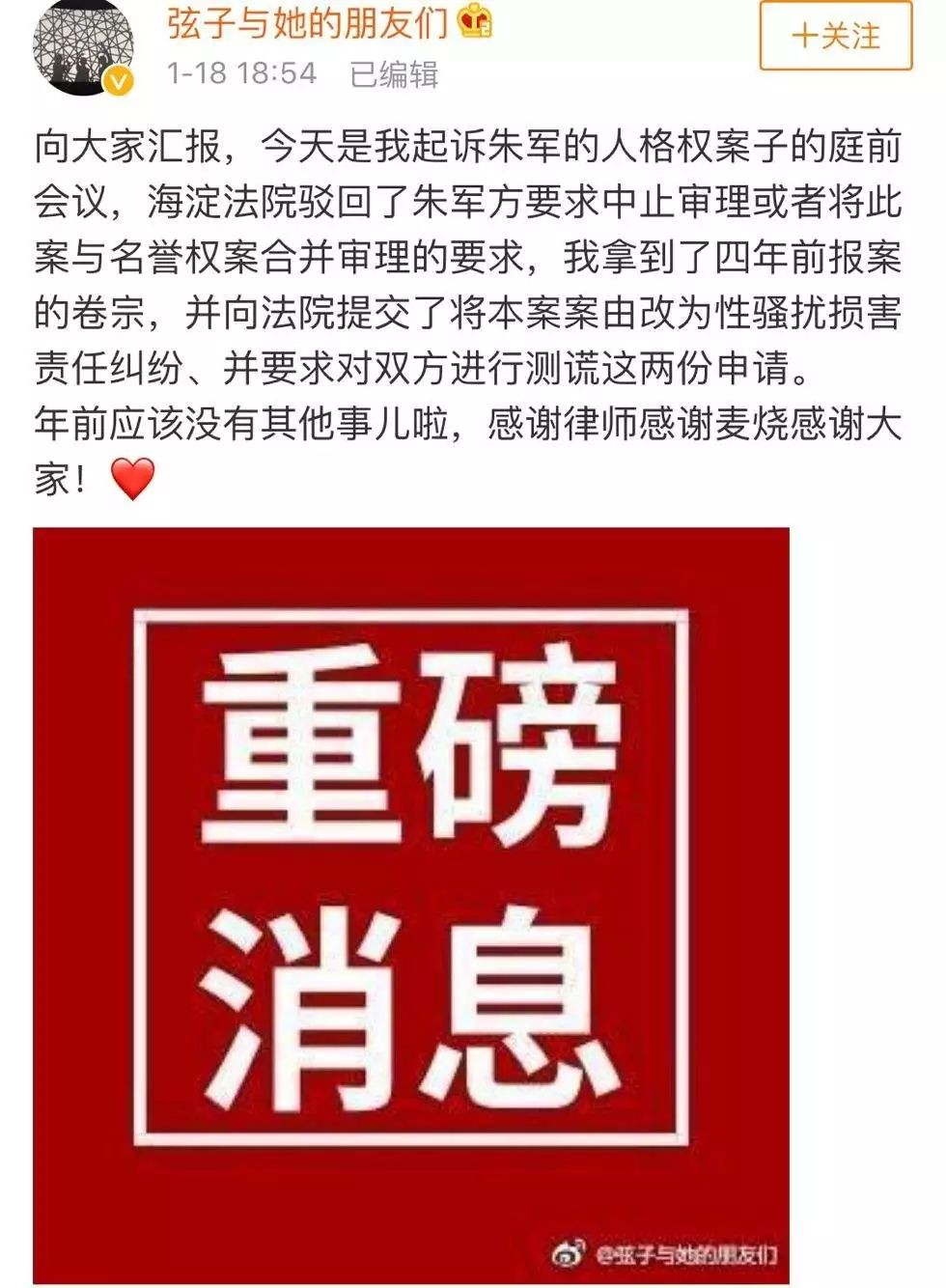 “向大家汇报,今天是我起诉朱军的人格权案子的庭前会议,海淀法院驳回了朱军方要求中止审理或者将此案与名誉权案合并审理的要求,我拿到了四年前报案的卷宗,并向法院提交了将本案案由改为性骚扰损害责任纠纷、并要求对双方进行测谎这两份申请。年前应该没有其他事儿啦,感谢律师感谢麦烧感谢大家!”