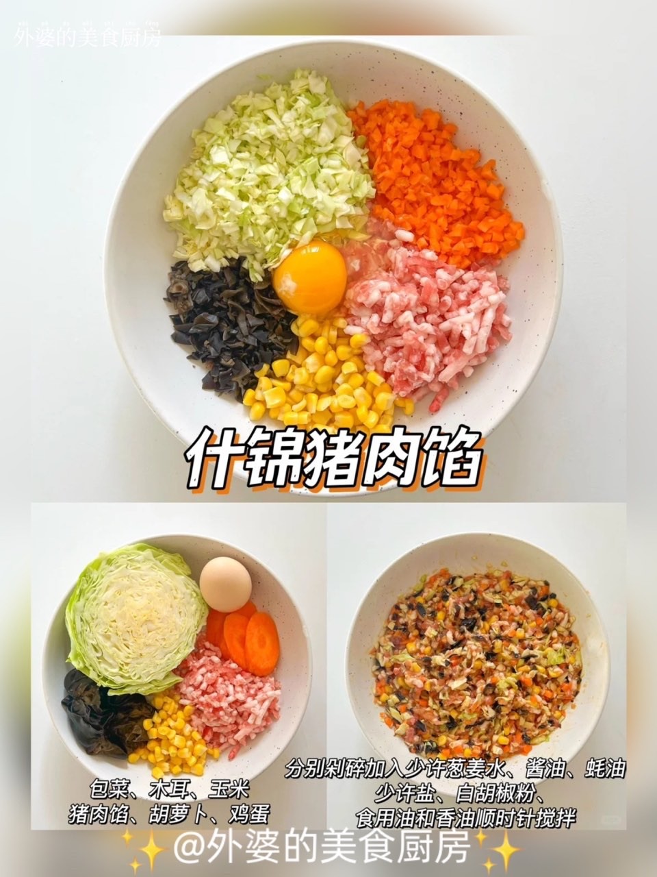 食材:包菜、木耳、玉米、胡萝卜、鸡蛋、葱、姜、猪肉、盐、酱油、蚝油、白胡椒粉、香油、食用油