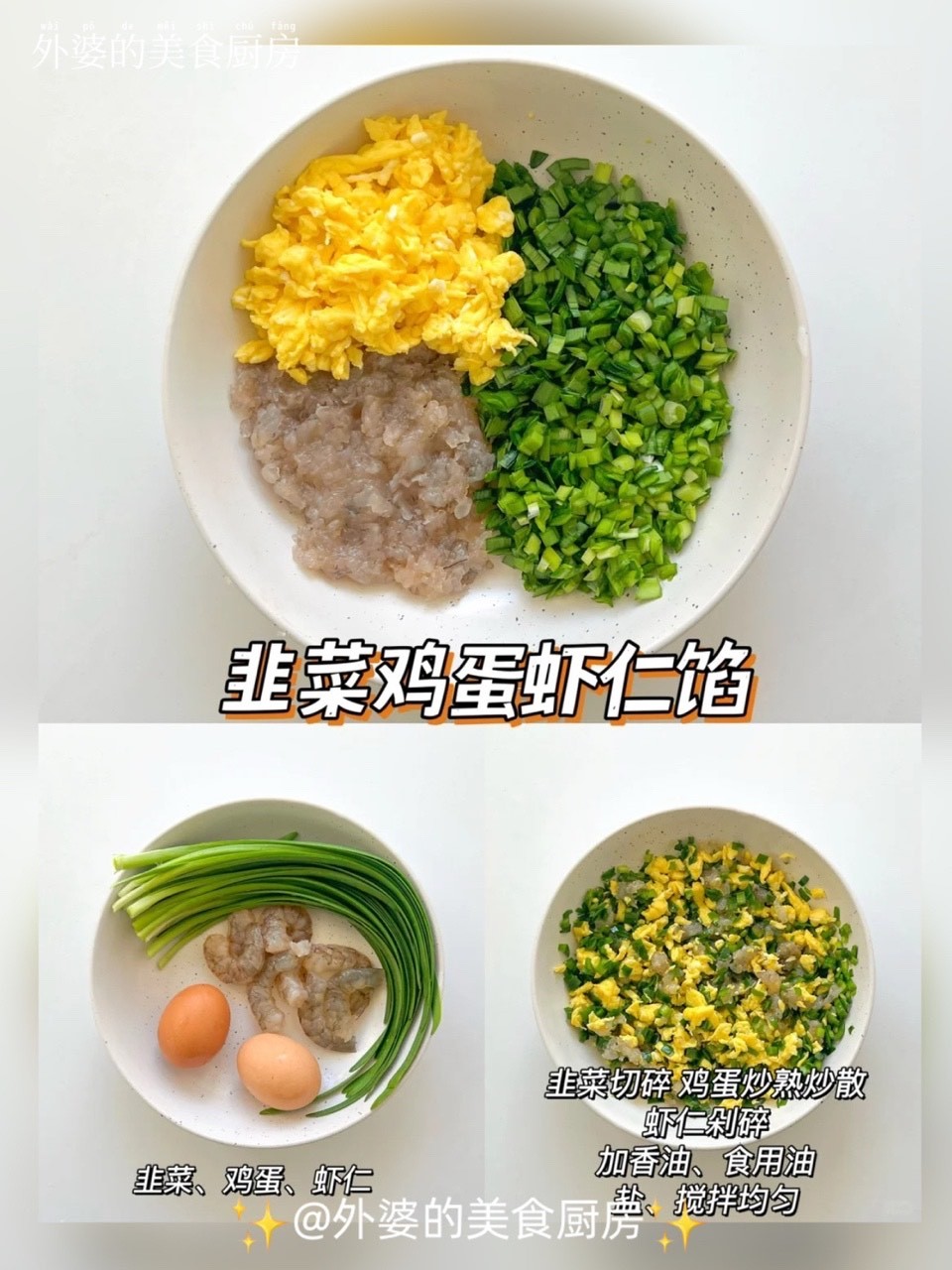 食材:韭菜、鸡蛋、虾仁、葱、姜、猪肉、盐、酱油、蚝油、白胡椒粉、香油、食用油