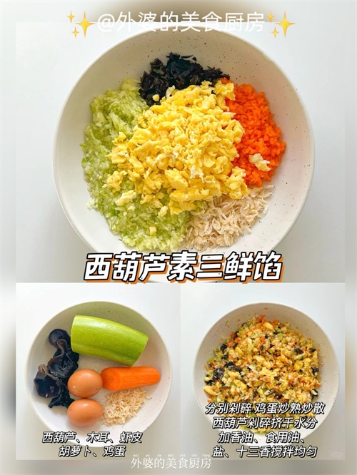 1.西葫芦、木耳、胡萝卜剁碎,鸡蛋炒熟、虾皮备用